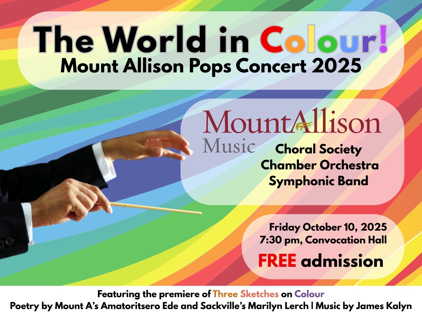 “The World in Colour” is an exploration of the ways colour is sketched in sound, performed by the Mount Allison Symphonic Band, Choral Society, and Chamber Orchestra, directed by Prof. James Kalyn and Dr. Kiera Galway. The concert will feature a new work for chorus and orchestra with music by James Kalyn and original texts by local poets. Admission is free and all are welcome to attend; donations received at the door with proceeds for student scholarships and awards. For information, call (506) 364-2374 or email music@mta.ca.