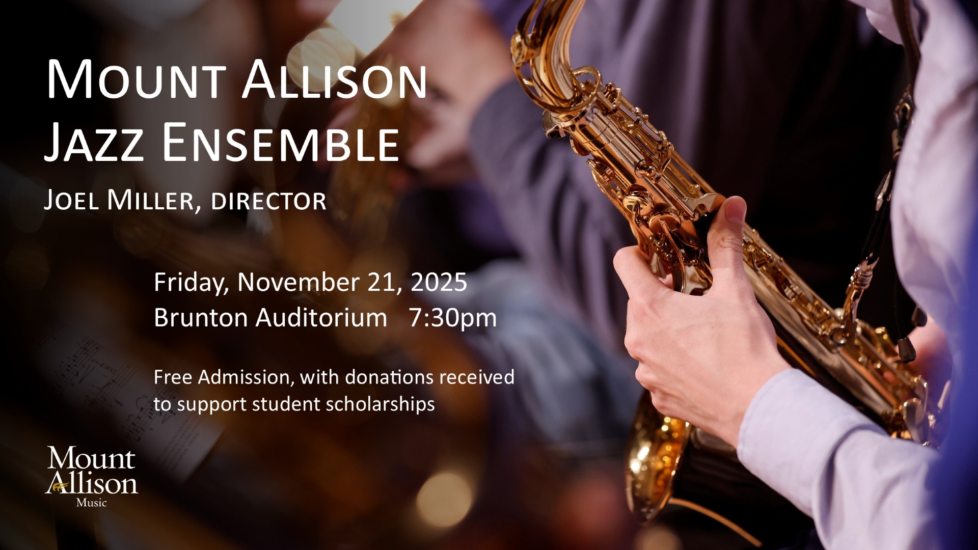 A concert by the Mount Allison Jazz Ensemble, directed by saxophonist and composer Joel Miller, featuring performances by Mount Allison students. Admission is free; donations will be received at the door, with proceeds for student scholarships and awards. For information call 506-364-2374 or email music@mta.ca.