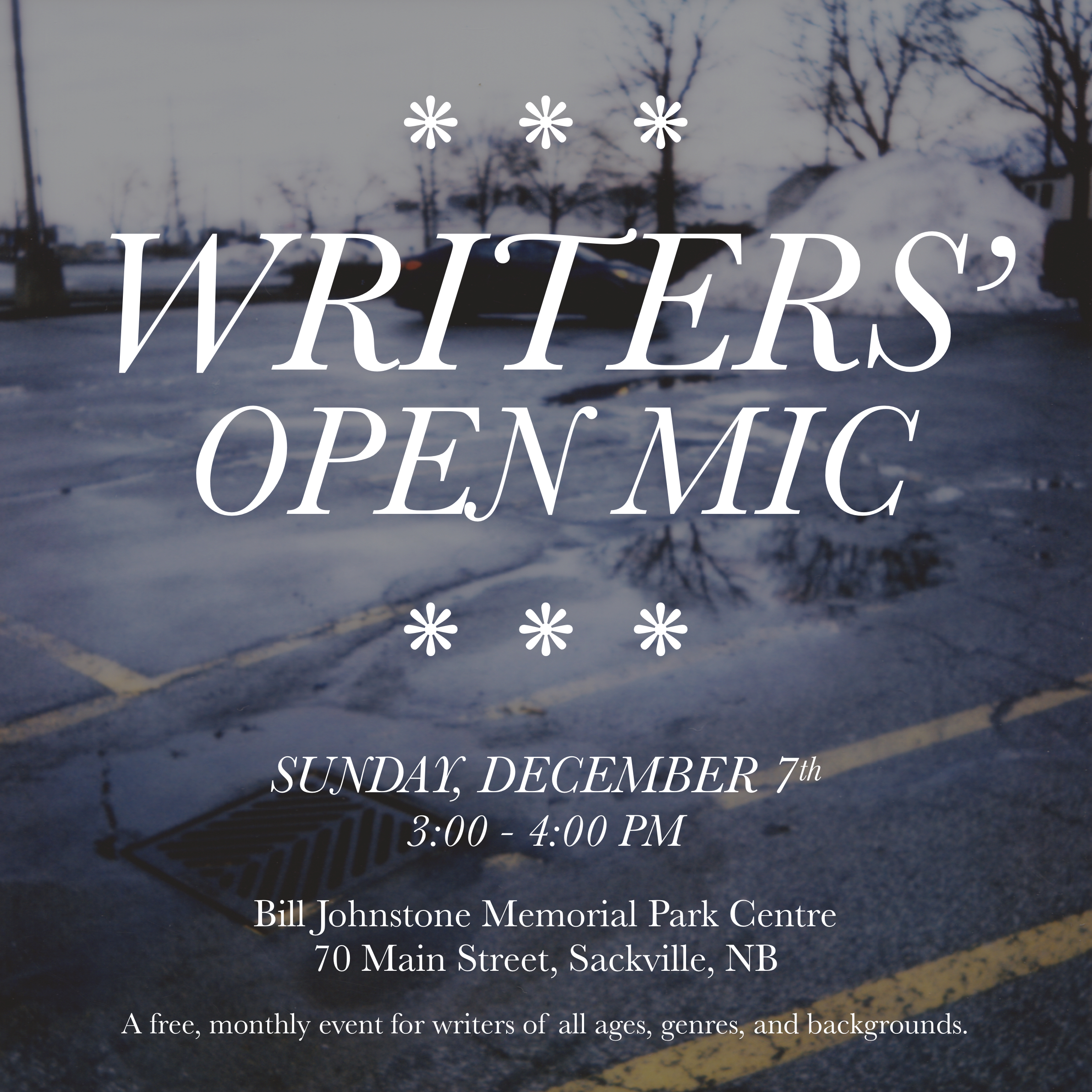 The Writers’ Open Mic is a free monthly event open to all. Come out and read your poems, songs, short stories, comics, novels, essays, stand-up comedy, etc. Or just come to listen. A projector will be set up for those with comics or other images or videos they want to share. Just bring your files along on a USB. Accessibility concerns and general questions can be directed to laurawatsonartwork@gmail.com. Follow the Writers’ Open Mic on Instagram at @writersopenmic for updates.