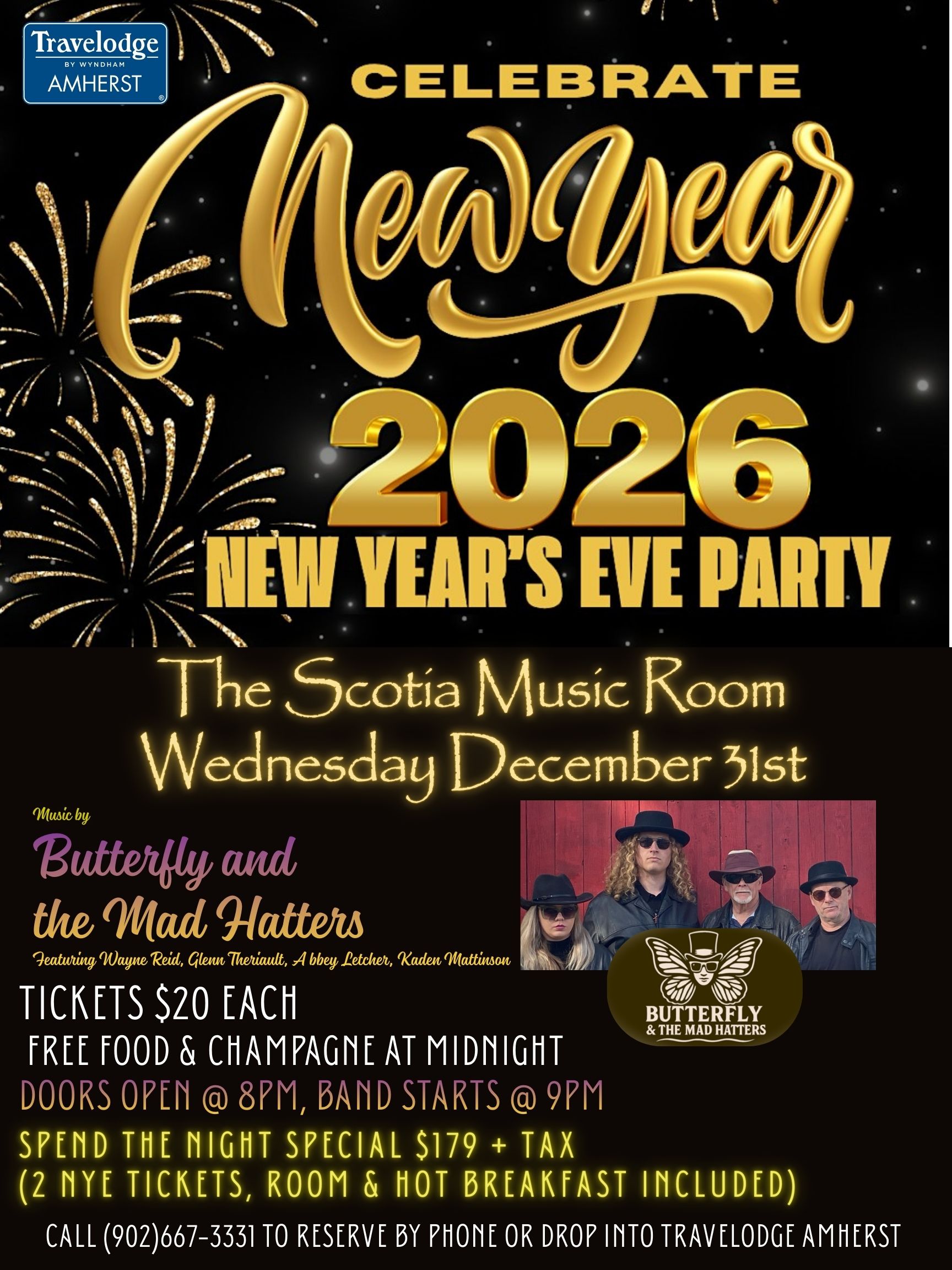 Ring in 2026 with the BIGGEST New Year’s celebration in Cumberland County! Tickets: Only $20 each! Includes: FREE food all night Champagne at midnight Dancing & incredible live music Drink specials all night long Live Entertainment: Butterfly & The Mad Hatters Featuring Wayne Reid, Glenn Theriault, Abbey Letcher & Kaden Mattinson will be rocking the Scotia Music Room with all your favourites to keep the party going! Get ready for a night of great music, great vibes, and a packed dance floor! SPEND THE NIGHT – NYE TRAVELODGE SPECIAL! Make a night of it — and leave the driving behind! For just $179 + tax, enjoy: One-night stay for two (single Double/Queen room as available) Two NYE party tickets Full hot breakfast on New Year’s Day Access to our Pool, Sauna & Hot Tub Late Check-out For Just $199 +tax, enjoy: One-night stay for two in King Suite Two NYE party tickets Full hot breakfast on New Year’s Day Access to our Pool, Sauna & Hot Tub Late Check-out Or for just $249 + tax, One-night stay for four (2 Double/Queen beds as available) Four NYE party Tickets Full hot breakfast on New Year’s Day Access to our Pool, Sauna & Hot Tub Late Check-out The convenience of partying AND staying in the same building! Call (902) 667-3331 to book tickets or for reservations. Or drop in to the Travelodge Amherst 1539 Southampton Rd, Amherst to pick up your tickets. THIS EVENT SOLD OUT LAST YEAR!!!!