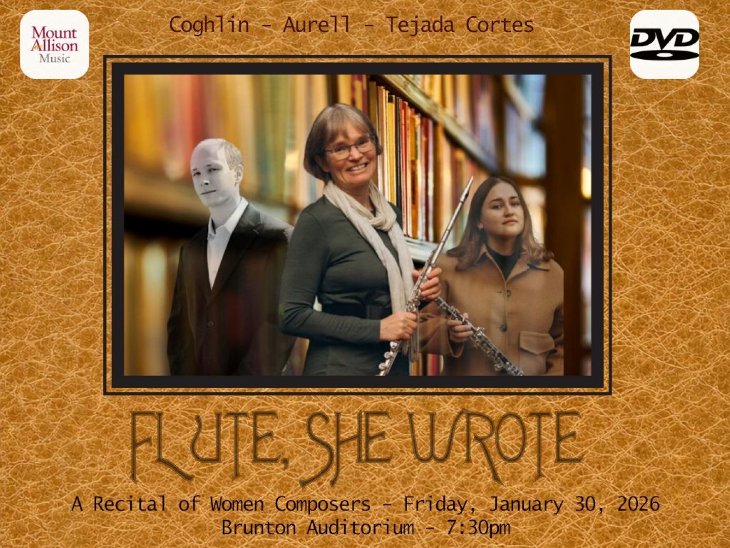 Karin Aurell (flute) and James Coghlin (piano) will be joined by Daniella Tejada Cortes (oboe) as they explore flute music by women composers, including Anna Bon, Mel Bonis, Claude Arrieu, Jocelyn Morlock, and Valerie Coleman. Tickets may be purchased at the door (cash sales): $15 adults; $10 seniors and students; $30 family. Subscriptions also available. Free for current Mount Allison students with a valid ID card