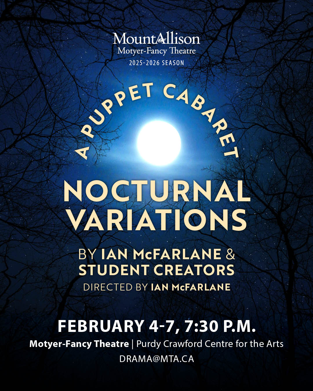 An endless night filled with sleepless dreams opens a floodgate to visions of joy, grief, and transformation. Welcome to Nocturnal Variations, the cabaret where consciousness is relative and the performances are more-than-human. Featuring original puppet acts created by Mount Allison students, this design-led, devised theatre creation addresses the precarity of our current moment through humour, grace, and absurdity. Suggested audience 14+