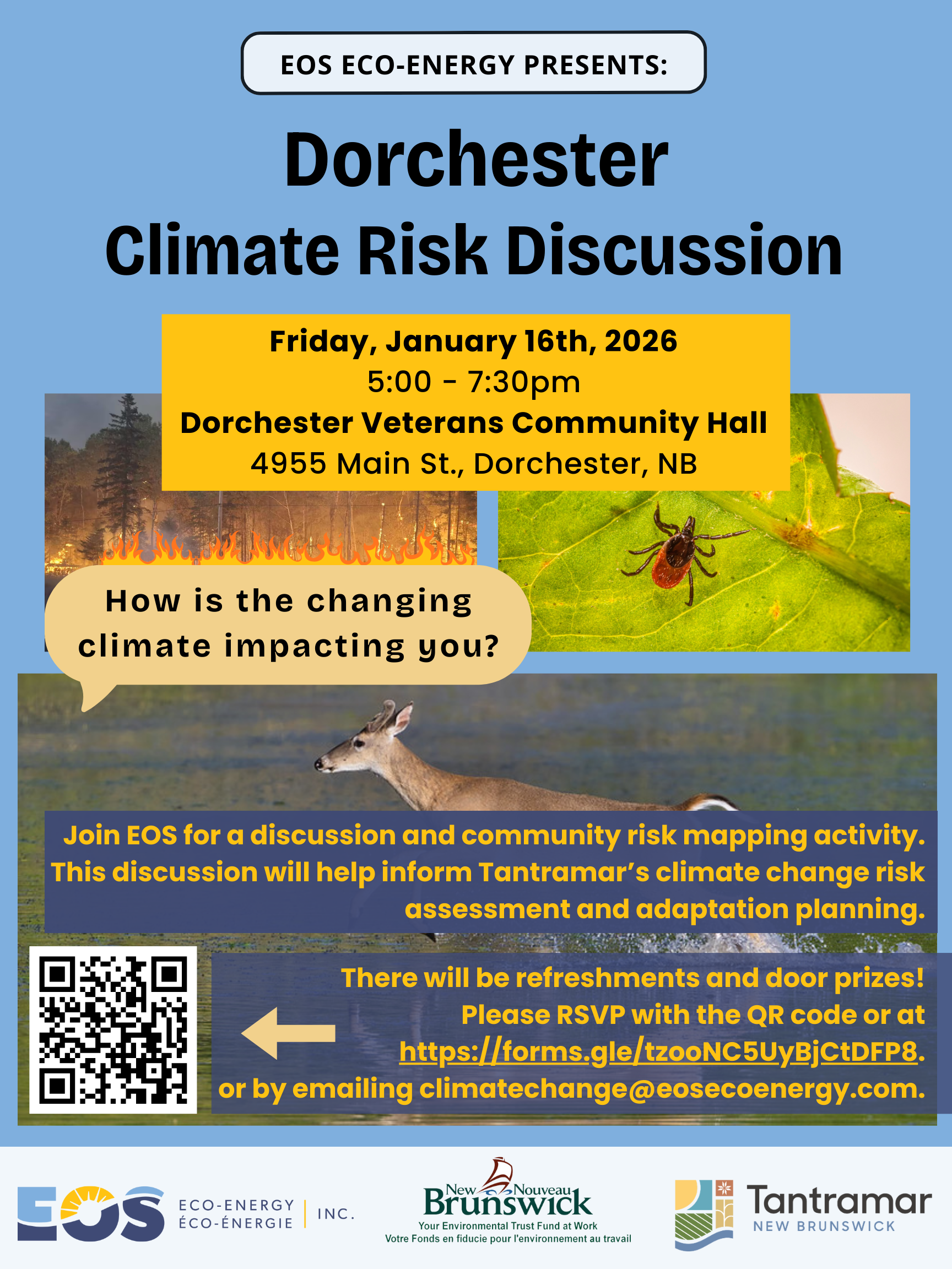 How is the changing climate affecting you and your community? Do you feel prepared for weather emergencies? Join EOS from 5-7:30pm on Friday, January 16th, 2026 at the Dorchester Veterans Community Hall for a discussion and community risk mapping activity. Please RSVP here: https://forms.gle/tzooNC5UyBjCtDFP8 or by emailing climatechange@eosecoenergy.com. There will be refreshments and door prizes! We hope to see you there. There will be a supervised Kids Corner with toys, books, and colouring supplies, so parents are welcome to bring their kids along! The experiences and concerns expressed in this session will contribute to Tantramar's climate change adaptation plan, in a way that is fully anonymous and confidential outside of the in-person gathering. This event is made possible by funding from the New Brunswick Environmental Trust Fund and the Municipality of Tantramar.
