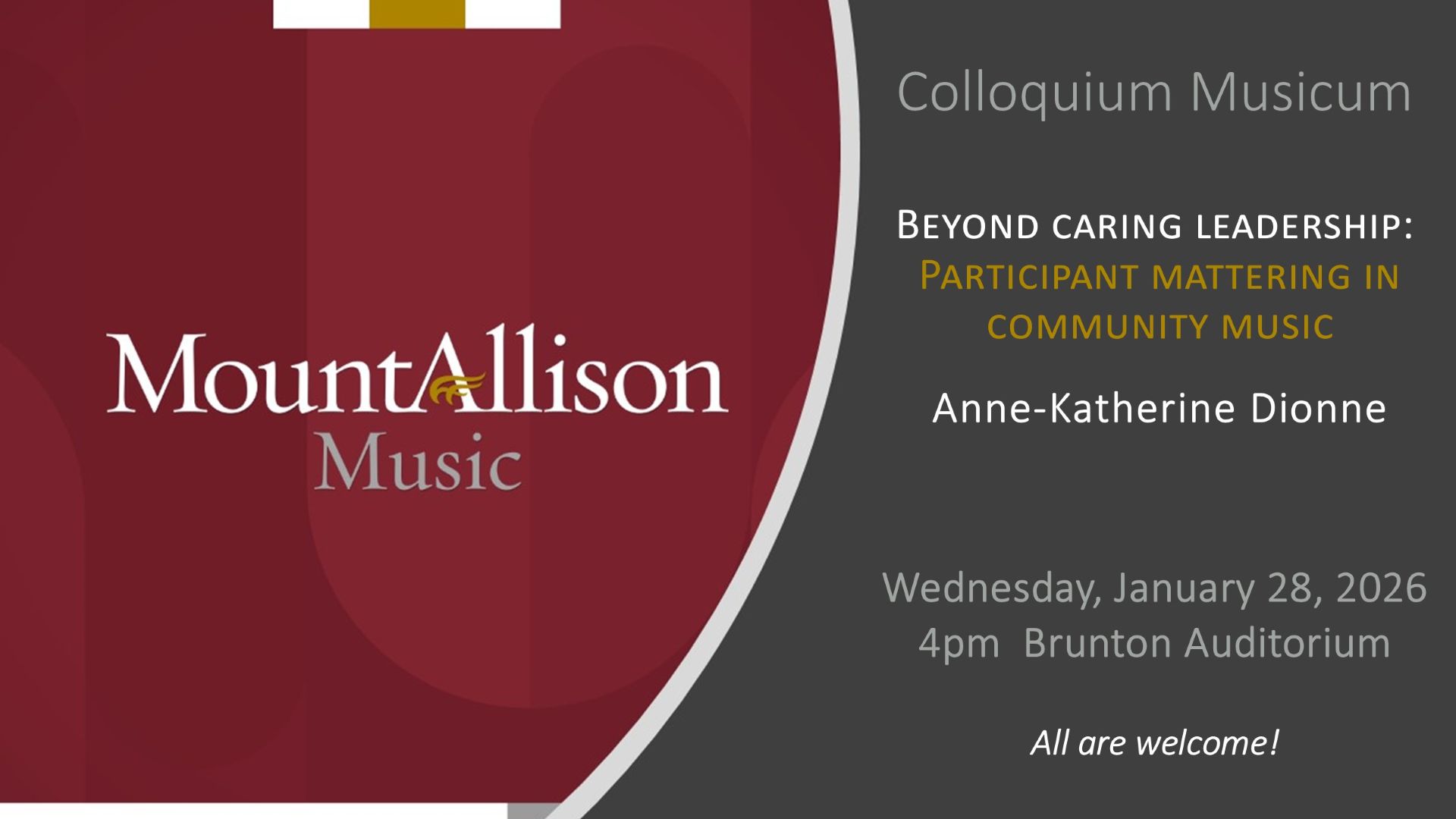 Prof. Anne-Katherine Dionne presents the Colloquium Musicum "Beyond caring leadership: Participant mattering in community music." Mattering, the subjective belief that we are valued by others and that we add value to others’ lives, is essential for the development of self-worth and purpose. Put another way: mattering gives meaning to our lives. Recognizing that our experience of mattering is shaped by our experience of others’ caring, in this presentation, Prof. Dionne explores care ethics and the construct of mattering with reference to a music-making context that is often imbued with care: community music. Admission is free and everyone is invited to attend. For information call 506-364-2374 or email music@mta.ca.