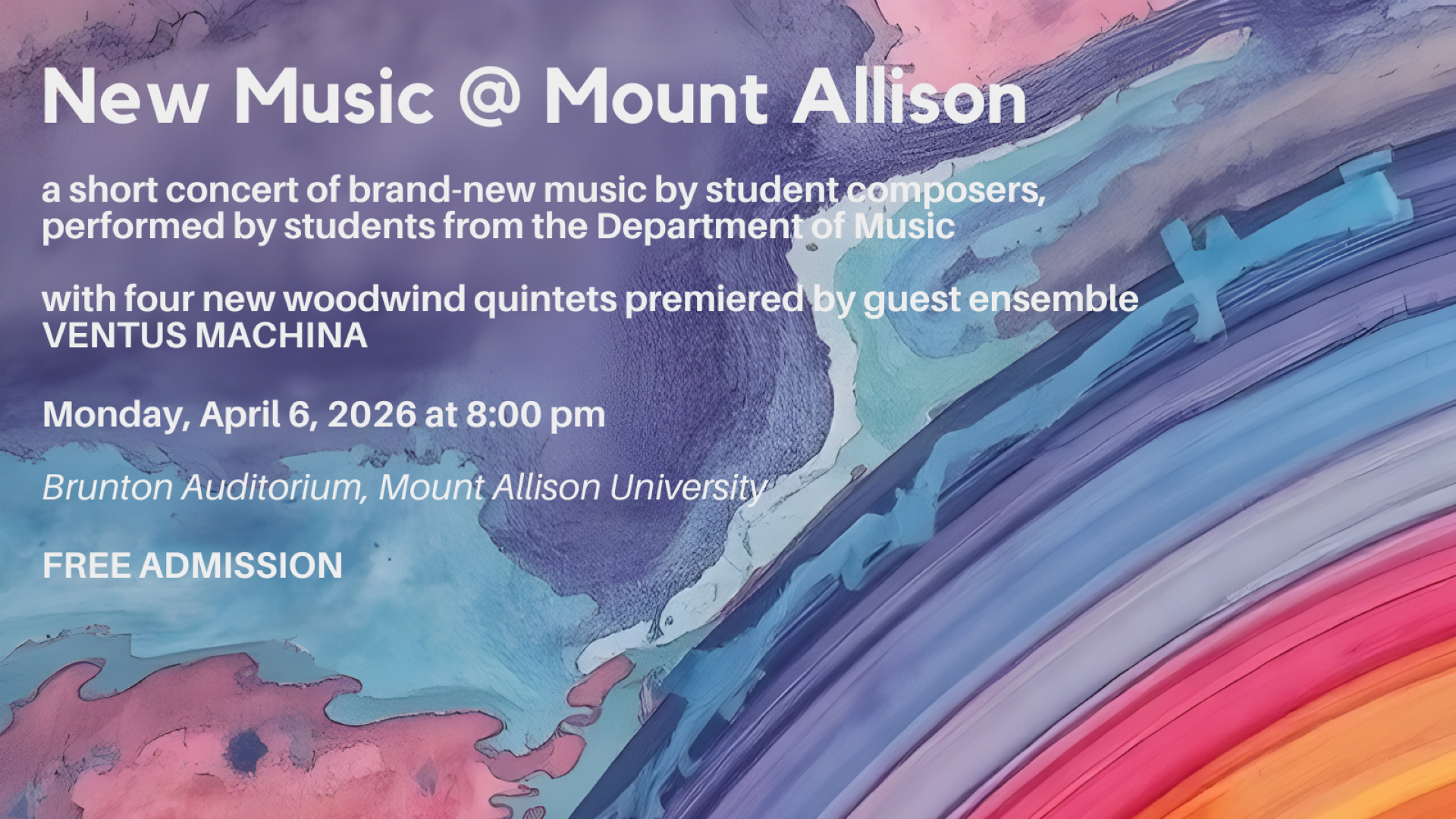 A short concert of brand-new music by student composers, performed by students from the Department of Music, with four new woodwind quintets premiered by guest ensemble Ventus Machina. Admission is free; all are welcome to attend. For more information call 506-364-2374 or email music@mta.ca. See our full calendar of events at mta.ca/music.