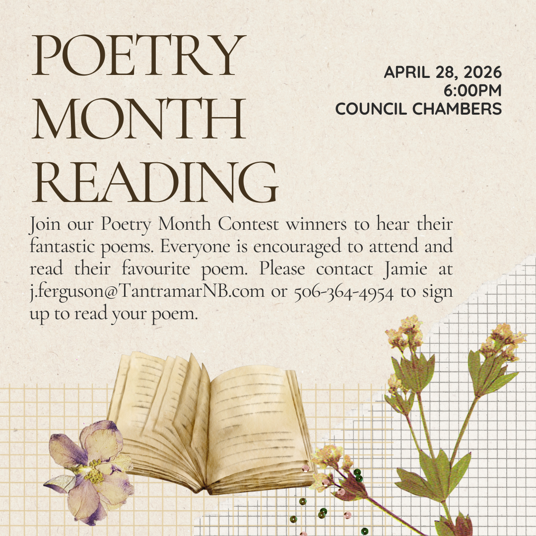 All are invited to an evening of poetry in the Municipal Council Chambers, including readings from local poets, the launch of the third annual Poets of Tantramar chapbook, and the announcement of the winners of Tantramar’s Poetry Contest.