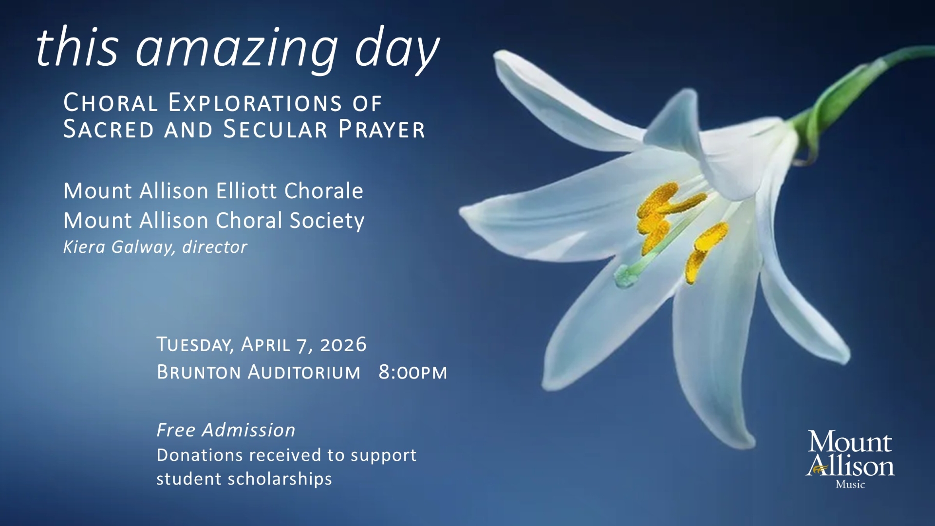 A performance by the Mount Allison Choral Society and Elliott Chorale, directed by Dr. Kiera Galway. Admission is free; donations received at the door with proceeds for student scholarships and awards. For more information call 506-364-2374 or email music@mta.ca. See our full calendar of events at mta.ca/music