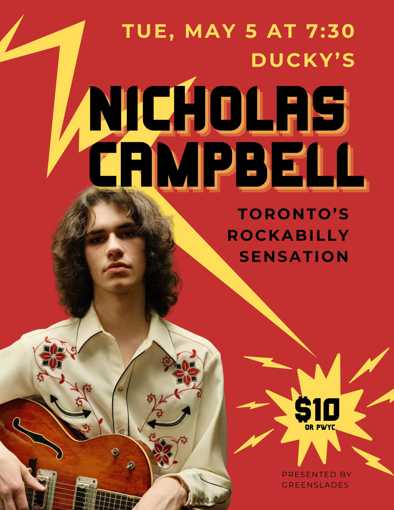 Fresh off a residency at Toronto's legendary Horseshoe Tavern, young guitar slinger Nicholas Campbell hits Ducky's on Tuesday, May 5th with his ace backing band The Metre Cheaters. Merging the sounds of rockabilly from the genre's golden era with a crooning style like no other, at 22 years old Campbell has gained himself a reputation as “the real deal”. He's quickly established himself as one of the most-admired guitarists in Toronto. Now touring to support his latest album, "People Like To Talk" , his live show will leave you with plenty to talk about!